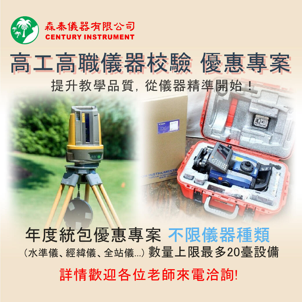 針對高工高職《儀器校驗統包優惠》方案,提供多種儀器的校驗與基本保養服務,包含水準儀、全站儀、GPS......等多種儀器與配件,一案最多可受理20台設備!